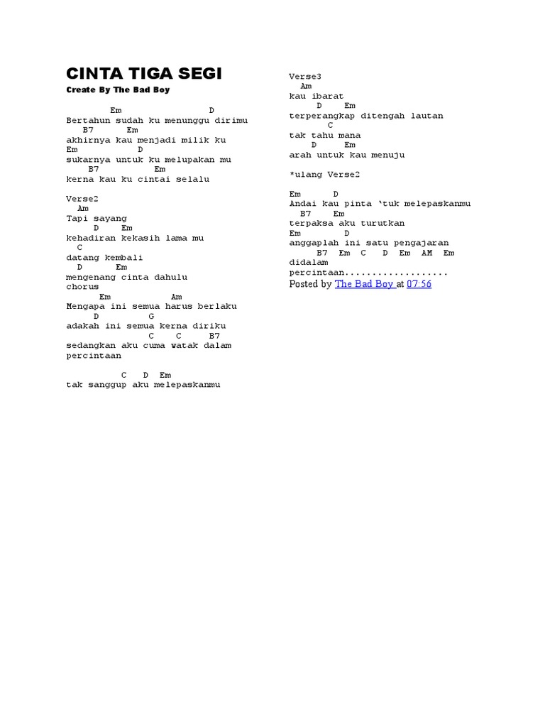 Kord gitar lagu cinta 3 segi Saleem-Cinta 3 Segi. Dengar jk lagu ni cnfm aku teringat kes ni bunuh tunang la tunang jd gila la. Adakah Chord Ini Tidak Boleh Transpose.